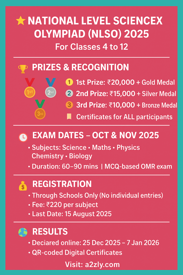 The National Level ScienceX Olympiad (NLSO) 2025, organized by ScienceX Innovations, is a prestigious competition for Classes 4 to 12 across India and neighboring countries. It promotes curiosity, critical thinking, …