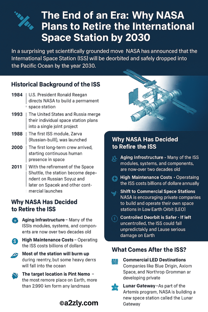 NASA has announced that the International Space Station (ISS) will be deorbited and safely guided into the Pacific Ocean by 2030. This marks the end of one of humanity’s most iconic space projects — a symbol of scientific achievement and global cooperation — and the dawn of a new era focused on commercial space stations and deep-space exploration.